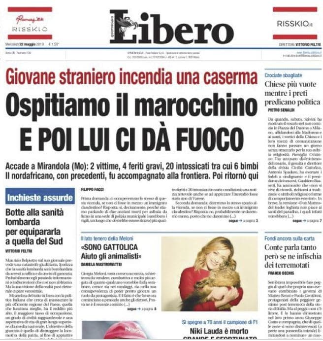 Ecco come titola Libero nella giornata di mercoledì: “Ospitiamo il marocchino e poi lui ci dà fuoco”.