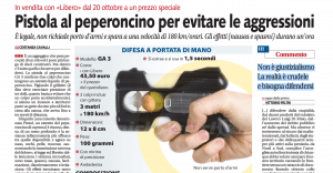“Pistola al peperoncino per evitare le aggressioni”, è il titolo. “È legale, non richiede porto d’armi e spara a una velocità di 180 km/orari. Gli effetti (nausea e spasmi) durano un’ora”. Quindi l’annuncio promozionale nell’occhiello dell’articolo: “In vendita con «Libero» dal 20 ottobre a un prezzo speciale”.