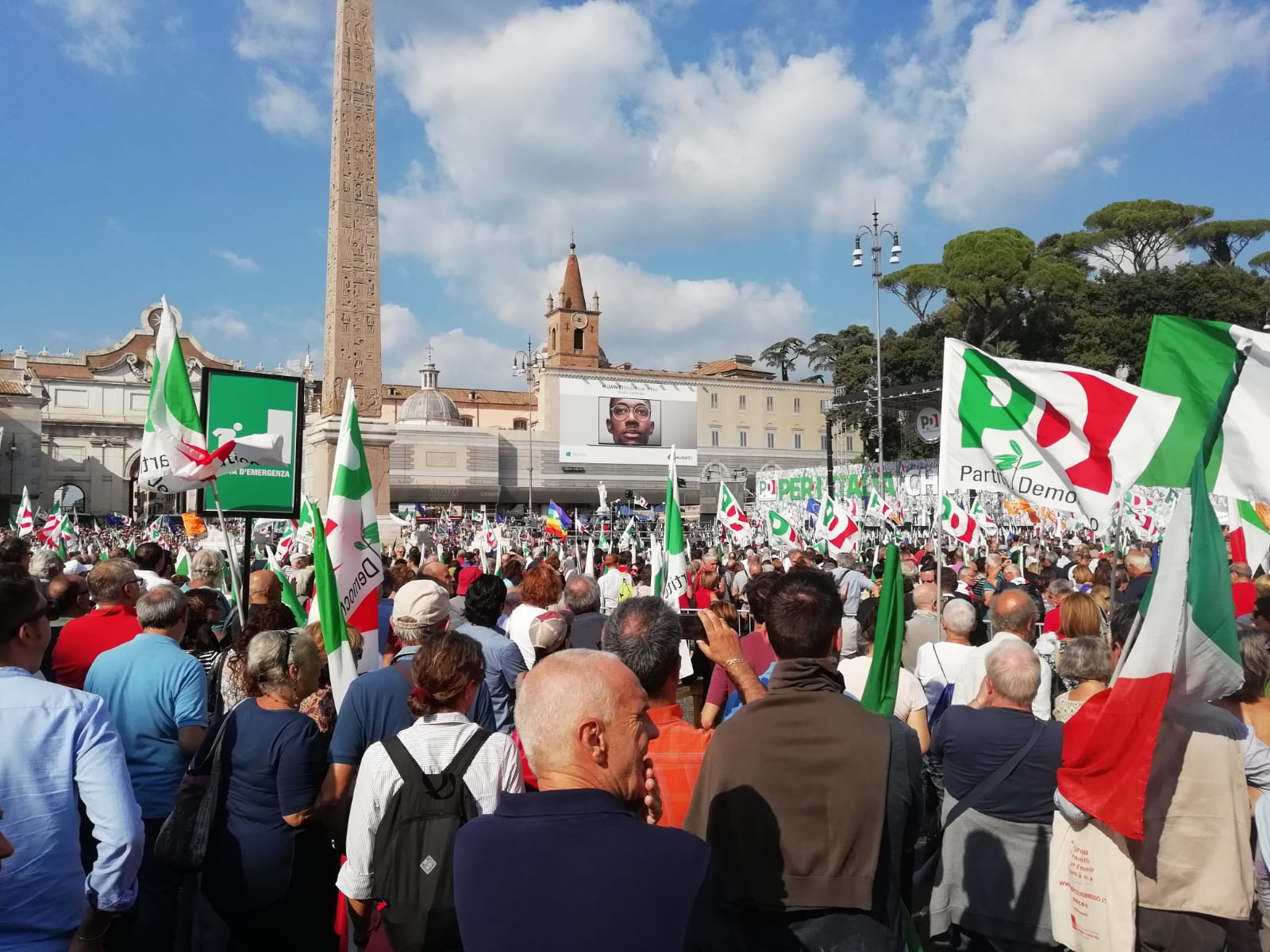 Sono convinti che ci sarà tanta gente e hanno ragione. La piazza è piena. Tante bandiere del Pd, alcune dell’Italia e moltissime dell’Europa. Solo un nostalgico con un cartello che ricorda la festa del primo maggio e i colori del vecchio Partito comunista. Parte l’inno di Mameli.