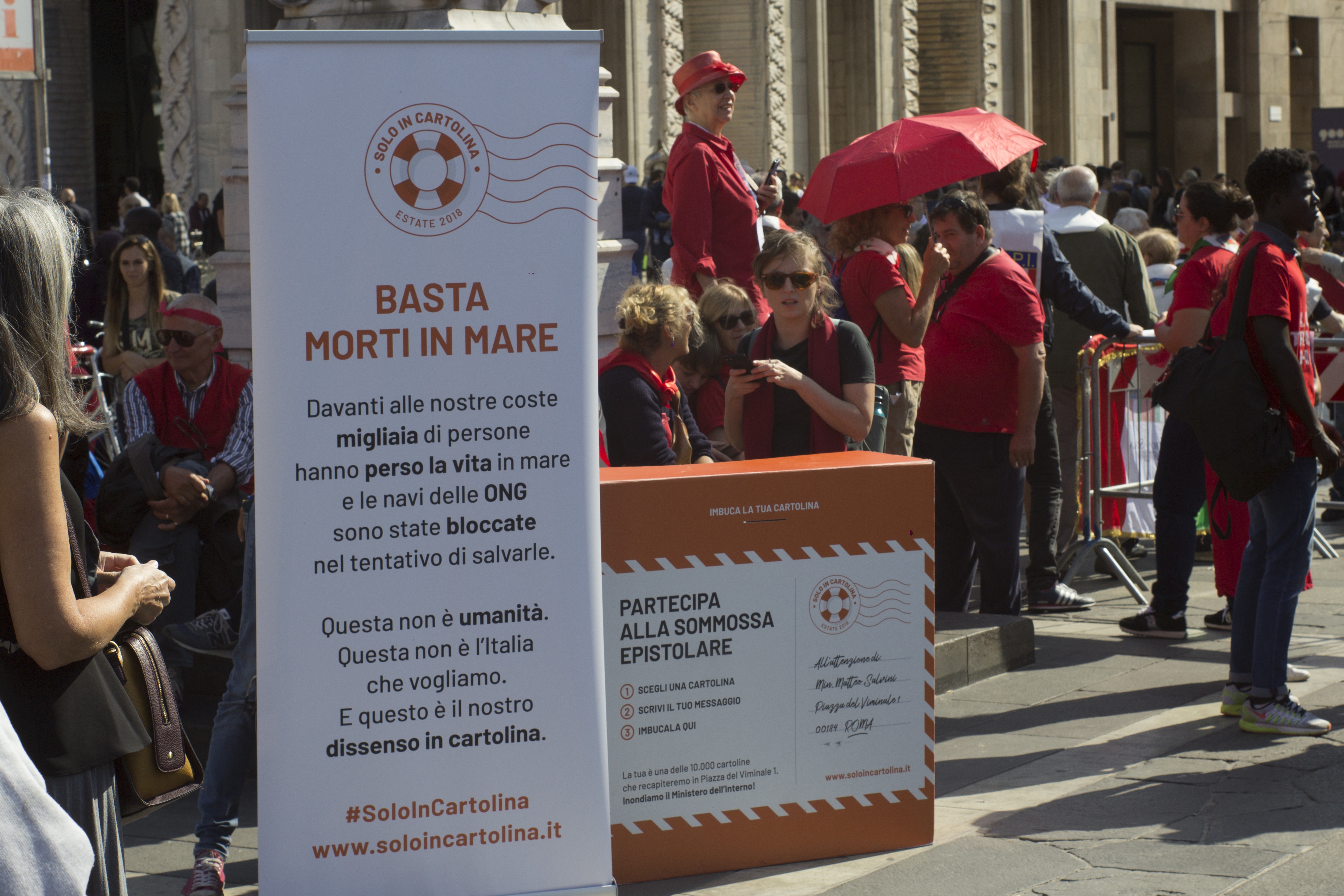 Ci sono anche rappresentanze di partito: Liberi e Uguali, Potere al Popolo, Partito comunista, Verdi. In un angolo della piazza è allestito un banchetto di “Solo in Cartolina”, la campagna lanciata in estate che intende spedire 10mila cartoline disegnate da molti creativi italiani al ministro dell’Interno, Matteo Salvini, per protestare contro le morti in mare.