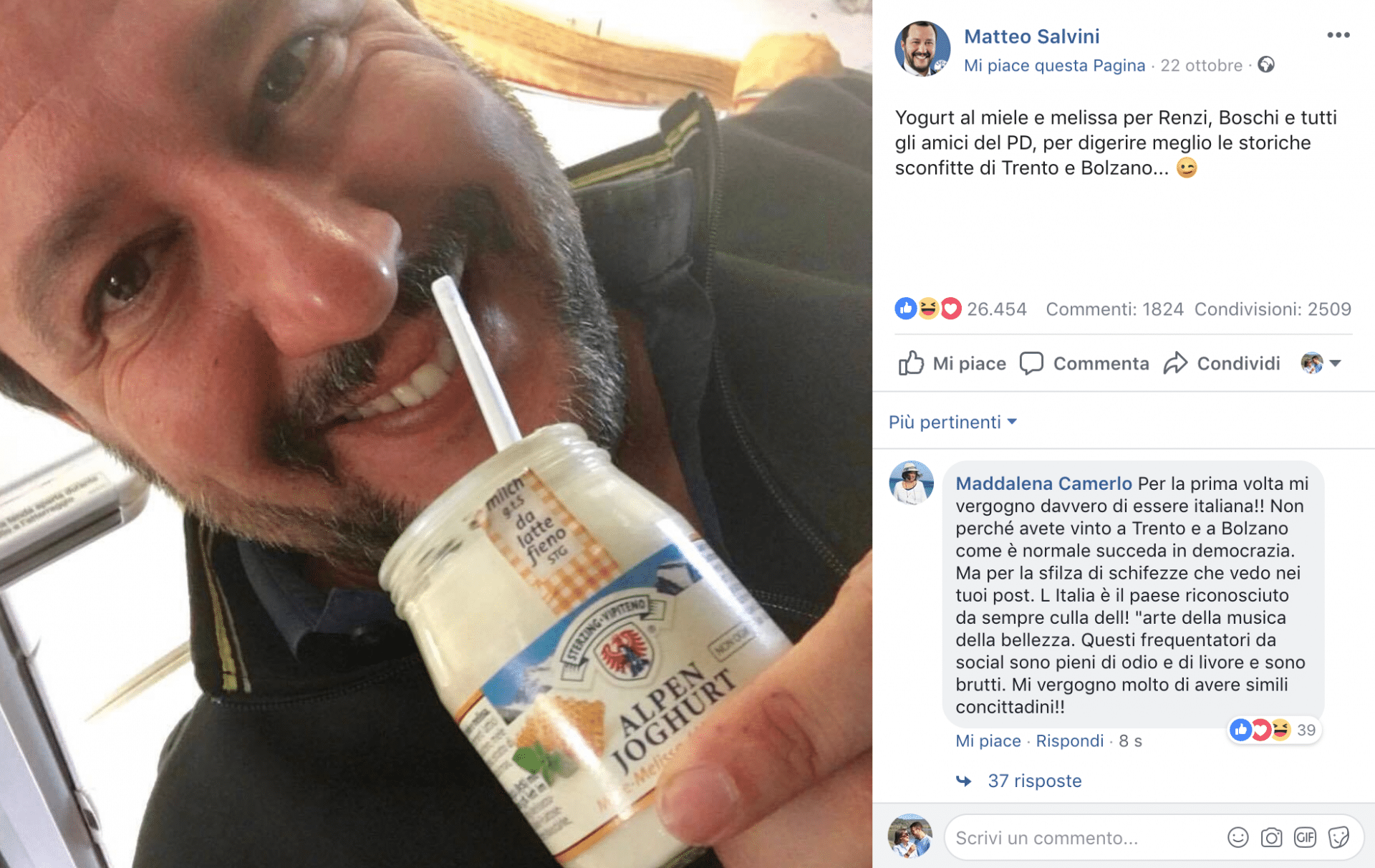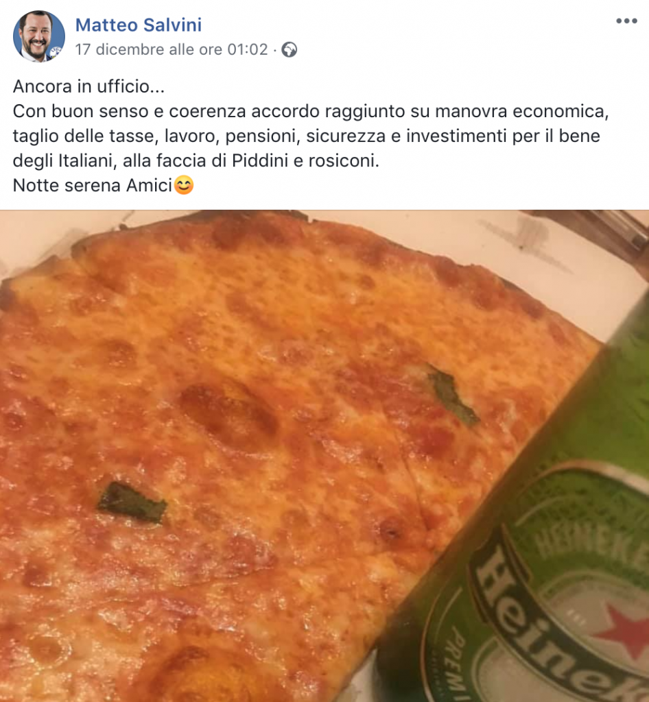 In questo modo il leader della Lega si mostra vicino alla gente comune, che allo stesso modo ama condividere su Instagram e Facebook i piatti che ha cucinato o che ha ordinato al ristorante.