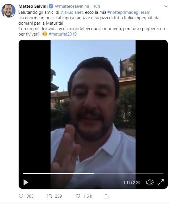 Fra i numerosi auguri sui social ai liceali dell’ultimo anno ci sono anche quelli del ministro dell’Interno Matteo Salvini, che nella serata di martedì ha pubblicato su Twitter un video messaggio indirizzato ai maturandi.
