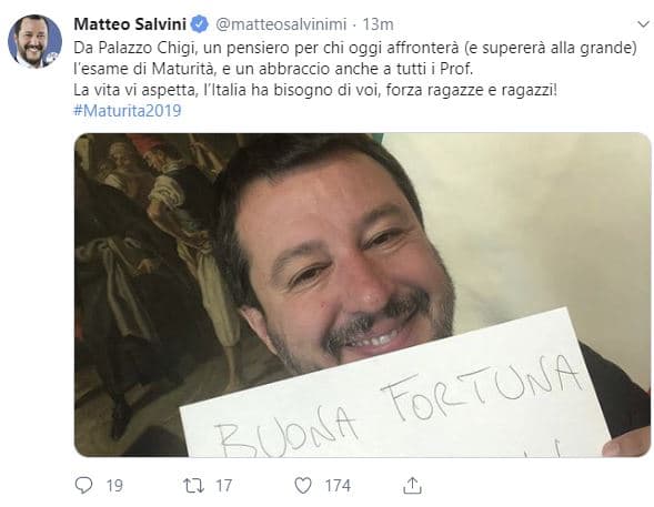 Poco prima delle 9 di mercoledì mattina, Matteo Salvini ha anche pubblicato, sempre su Twitter, un altro messaggio per i maturandi.