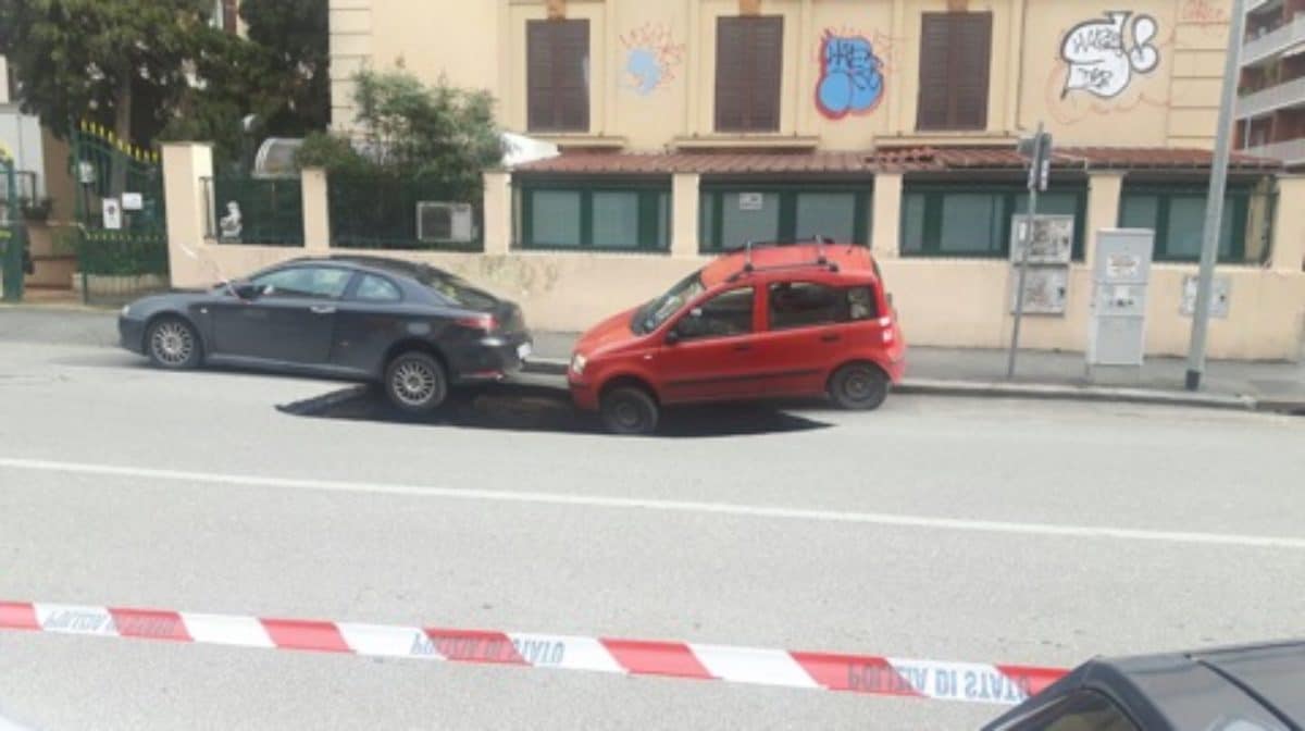 Il nastro della polizia, gli agenti e i vigili urbani intenti a deviare il traffico, i primi curiosi a guardare la terribile scena sull’altro lato della strada: due macchine in bilico sopra un’enorme voragine apertasi all’improvviso al centro della carreggiata.