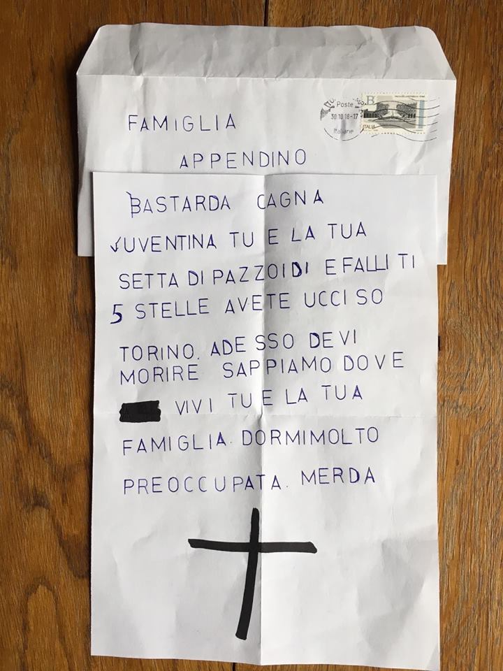“Bastarda cagna juventina tue la tua setta di pazzoidi e falliti 5 stelle avete ucciso Torino. Adesso devi morire. Sappiamo dove vivi tu e la tua famiglia. Dormi molto preoccupata. Merda”: