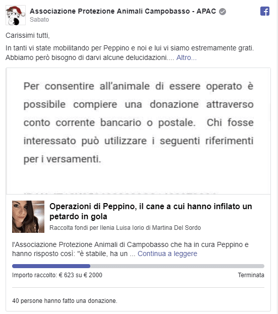La colletta- Adesso Peppino è affidato alle cure dell’Associazione Protezione Animali locale APAC, che opera sul territorio in aiuto, appunto, di animali abbandonati o maltrattati. Il veterinario che si sta occupando di lui ha fatto capire che ci sono speranze per la ricostruzione plastica della parte di muso andata persa, tant’è che tra qualche giorno procederà all’operazione. Proprio in tale ottica è stata lanciata la raccolta fondi necessaria al pagamento delle spese sostenute per tutto il trattamento ricevuto da Peppino, intervento compreso. In tanti hanno già donato.