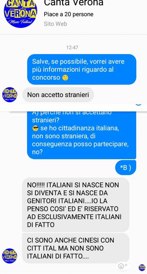 “Salve vorrei avere maggiori informazioni riguardo al concorso”, aveva scritto Dora all’organizzatore del concorso. “Non accetto stranieri”, era stata la risposta del gestore della pagina. “Perché non si accettano stranieri? se ho cittadinanza italiana non sono straniera, di conseguenza posso partecipare, no?”. “No!!!! Italiani si nasce non si diventa, e si nasce da genitori italiani…io la penso così ed è riservato esclusivamente a italiani di fatto. Ci sono anche cinesi con citt.itali. ma non sono italiani di fatto…”, si concludeva lo scambio di messaggi per chat.