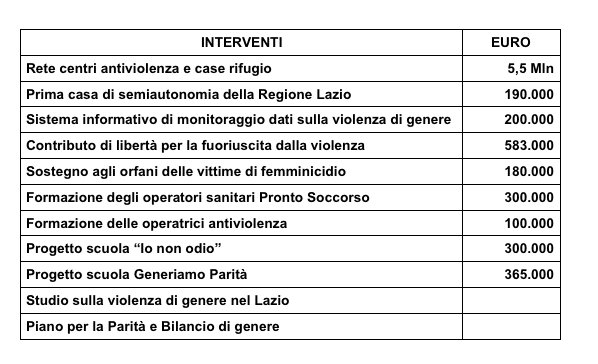 A queste risorse, inoltre, si uniscono circa 6 milioni di euro già impegnati dalla Giunta regionale per ulteriori azioni e iniziative come ad esempio la rete dei Centri antiviolenza, le Case rifugio della Regione Lazio e altri progetti previsti dal Protocollo d’intesa tra Regione, Procura Generale e Ordine degli Psicologi del Lazio per la tutela delle vittime vulnerabili.