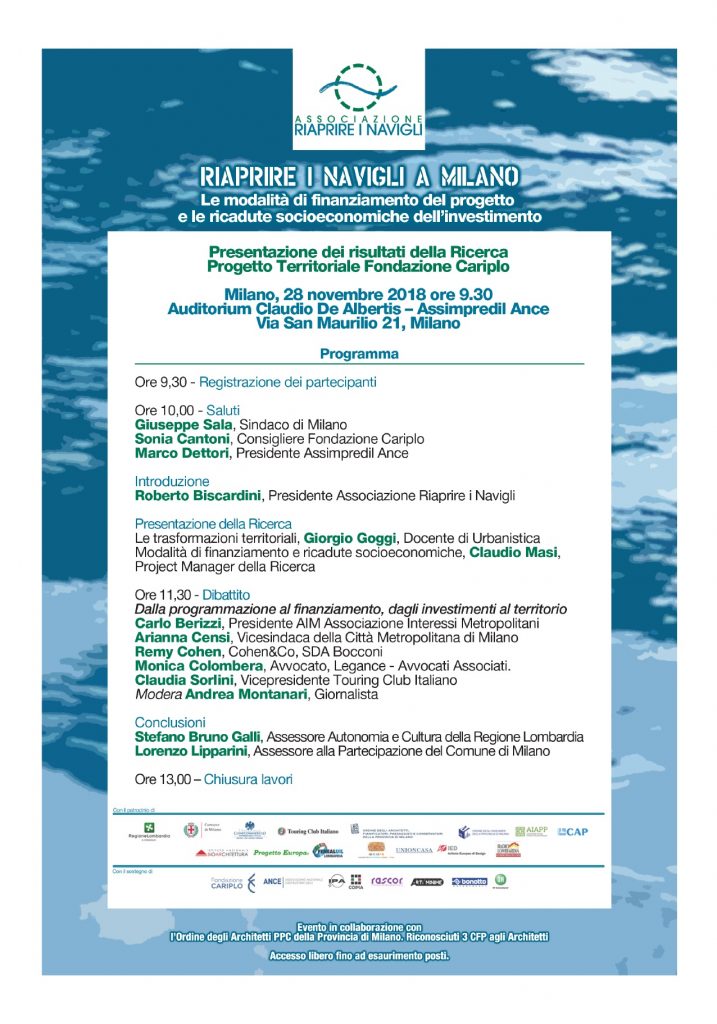 Giovedì 28 novembre 2018 a Milano si tiene un incontro pubblico sulla Riapertura dei Navigli presso l’Auditorium dell’Assimpredil Ance di via San Maurilio 21 dalle 9,30 alle 13.