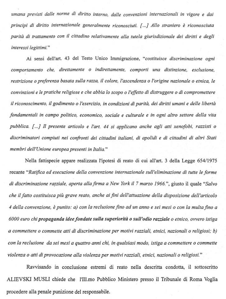 La denuncia fa riferimento anche all’articol 3 della legge 654/1975, che recita: “È punito: a) con la reclusione sino a tre anni chi diffonde in qualsiasi modo idee fondate sulla superiorità o sull’odio razziale o etnico, ovvero incita a commettere o commette atti di discriminazione per motivi razziali, etnici, nazionali o religiosi; b) con la reclusione da sei mesi a quattro anni chi, in qualsiasi modo, incita a commettere o commette violenza o atti di provocazione alla violenza per motivi razziali, etnici, nazionali o religiosi”.