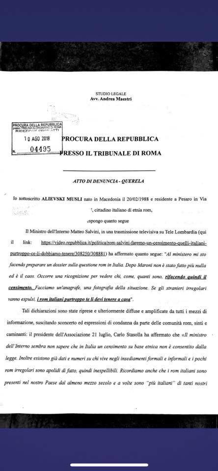 Venerdì 10 agosto Alievski Musli, un cittadino italiano di etnia Rom originario della Macedonia, ha depositato alla procura della Repubblica di Roma una denuncia contro Matteo Salvini per violazione della Costituzione, del Testo Unico sull’Immigrazione e delle norme contro le discriminazioni.