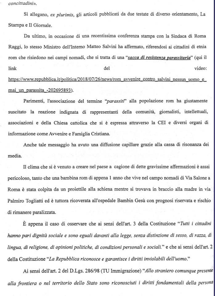 La denuncia fa riferimento a diverse affermazioni di Salvini sui Rom, e in particolare ad alcune frasi pronunciate dal leader della Lega in una trasmissione su TeleLombardia in cui annunciava il censimento: “Al ministero mi sto facendo preparare un dossier sulla questione rom in Italia. Occorre fare una ricognizione per vedere chi, come, quanti sono, rifacendo quindi il censimento. Facciamo un’anagrafe, una fotografia della situazione. Se gli stranieri irregolari vanno espulsi, i rom italiani purtroppo te li devi tenere a casa”, aveva detto il vicepremier.