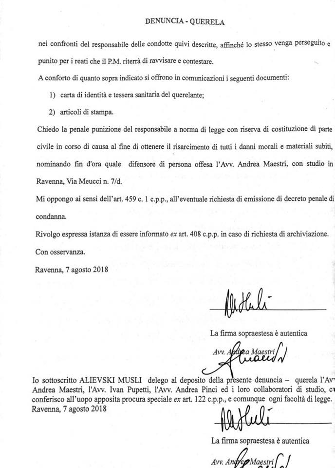 La denuncia è stata depositata venerdì 10 agosto alla procura della Repubblica di Roma. Ecco il testo integrale