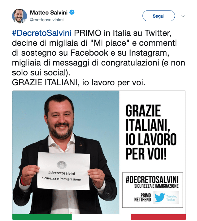 “#DecretoSalvini PRIMO in Italia su Twitter, decine di migliaia di Mi piace e commenti di sostegno su Facebook e su Instagram, migliaia di messaggi di congratulazioni (e non solo sui social). GRAZIE ITALIANI, io lavoro per voi”.