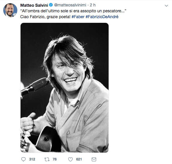 Anche Matteo Salvini ha voluto rendere omaggio a Fabrizio De André, nel giorno del ventesimo anniversario della morte del cantautore genovese. Il vicepremier ha sempre dichiarato di essere un fan del grande Faber. Su Twitter Salvini ha citato un brano della canzone Il pescatore, del 1968.