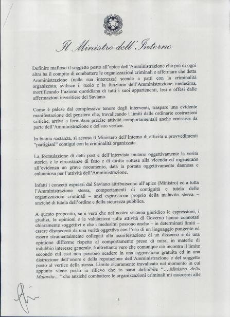 Insomma, la vicenda finirà in tribunale e sarà un giudice a diree se abbia ragione Saviano o il ministro dell’Interno.