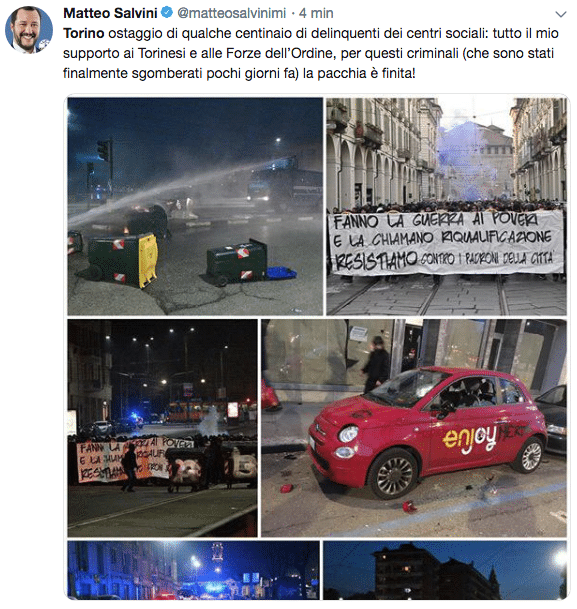 Sugli scontri si è espresso il vicepremier e ministro dell’Interno Matteo Salvini che su Twitter ha scritto: Torino ostaggio di qualche centinaio di delinquenti dei centri sociali: tutto il mio supporto ai Torinesi e alle Forze dell’Ordine, per questi criminali (che sono stati finalmente sgomberati pochi giorni fa) la pacchia è finita!