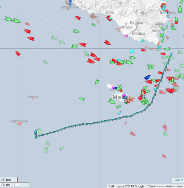 Questo è invece il percorso che la nave ha fatto dopo aver recuperato 47 naufraghi cinque giorni fa.