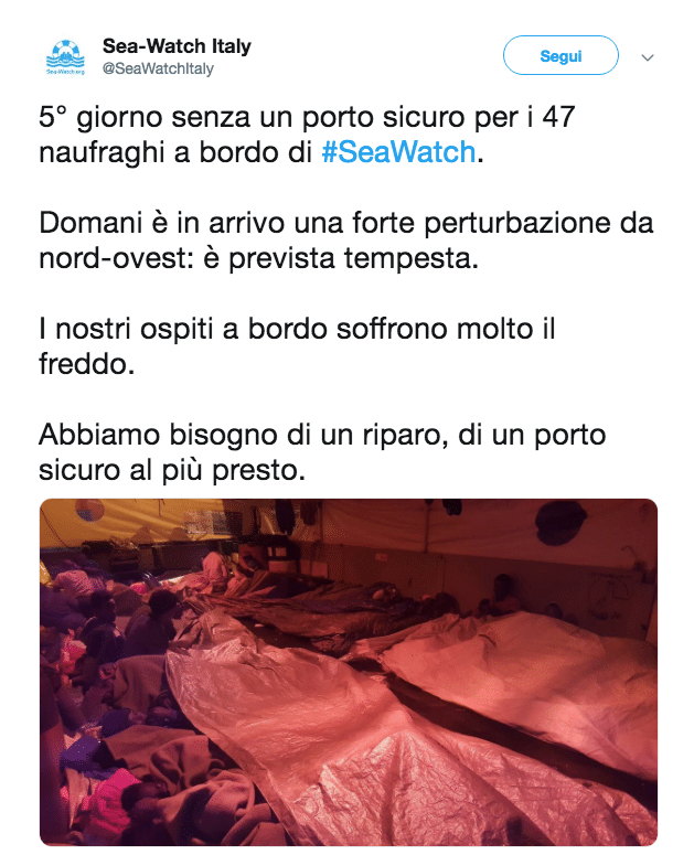 Alle 16.11 del 23 gennaio Sea Watch 3 pubblicava un tweet in cui si chiedeva con urgenza un porto sicuro: