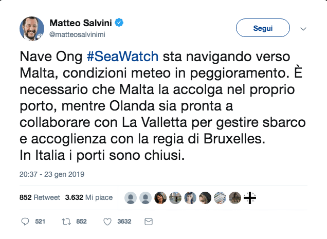 Il vicepremier Matteo Salvini nella serata del 23 gennaio ha scritto: “Nave Ong #SeaWatch sta navigando verso Malta, condizioni meteo in peggioramento. È necessario che Malta la accolga nel proprio porto, mentre Olanda sia pronta a collaborare con La Valletta per gestire sbarco e accoglienza con la regia di Bruxelles. In Italia i porti sono chiusi”.