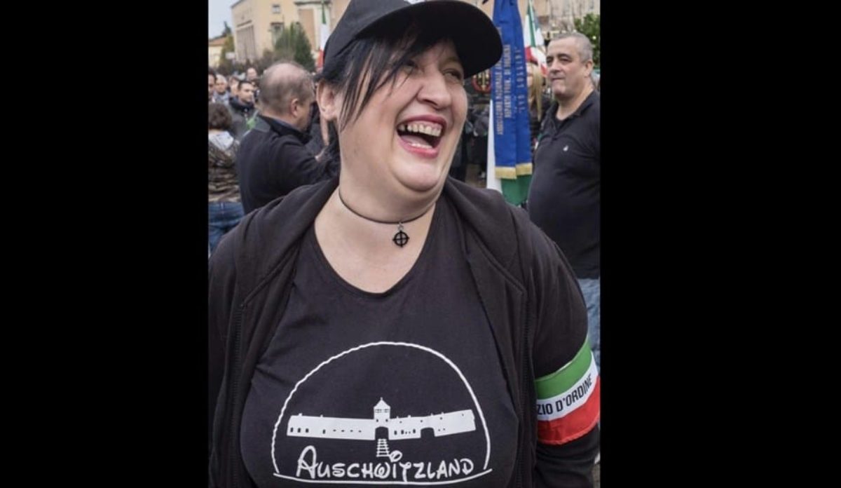 La donna, militante di Forza Nuova, indossava una maglietta che ha fatto discutere. La t-shirt portava il logo di“Auschwitzland” paragonando il lager a un campo divertimenti.