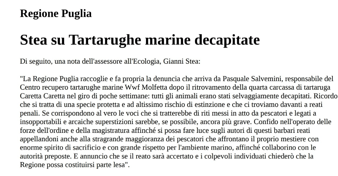 “C’era giunta voce che c’erano alcuni pescatori del nord Barese che uccidevano le tartarughe marine che trovavano impigliate nelle loro reti. – ha spiegato il responsabile del Centro di Recupero delle tartarughe Pasquale Salvemini in un’intervista alla Gazzetta del Mezzogiorno – L’indiscrezione ci è arrivata dal mondo stesso della pesca, perché le imbarcazioni comunicano tra loro attraverso la radio e alcuni amici avevano raccolto queste macabre dichiarazioni. Ma non ci volevo credere, specie perché la motivazione è ancora più sconvolgente: sembra che alcuni pensino che porta male trovare una tartaruga tra le reti, che portino con se la sfortuna di pescare poco nei giorni a venire. Ecco allora che come forma “sacrificale” o per vendicarsi le decapitano”.