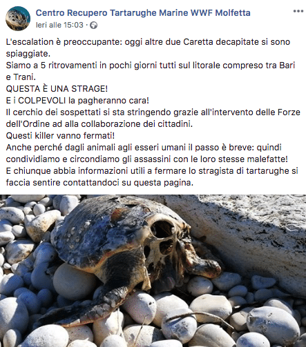 Il Centro recupero Wwf di Molfetta ha lanciato l’allarme su Facebook definendo l’episodio una vera e propria strage. “Il cerchio dei sospettati si sta stringendo grazie all’intervento delle Forze dell’Ordine ad alla collaborazione dei cittadini – si legge nel post. – Questi killer vanno fermati! Anche perché dagli animali agli esseri umani il passo è breve: quindi condividiamo e circondiamo gli assassini con le loro stesse malefatte! E chiunque abbia informazioni utili a fermare lo stragista di tartarughe si faccia sentire contattandoci su questa pagina”.