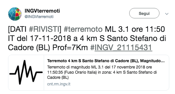 Terremoto a Belluno 17 novembre 2018: le ultime news sulle scosse di oggi