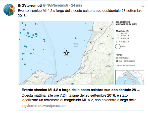 Una scossa di terremoto di magnitudo 4,2 è stata registrata nella mattina del 28 settembre 2018 nel sud della Calabria, in un’area compresa tra Catanzaro, Vibo Valentia e Reggio Calabria.