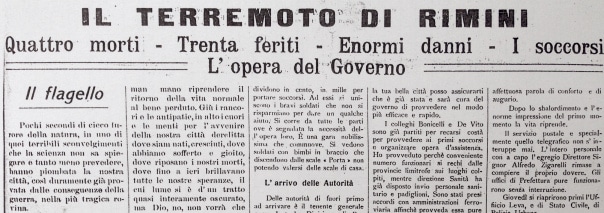 Una tragedia che il Corriere riminese descrisse così: “Pochi secondi di cieco furore della natura, in uno di quei terribili sconvolgimenti che la scienza non sa spiegare e tanto meno prevedere, hanno piombato la nostra città, così duramente già provata dalle conseguenze della guerra, nella più tragica rovina. Non occorrono aggettivi per ampliare l’articolo; basta un semplice sguardo alle torri smantellate, ai tetti scoperchiati, alle mura rovinanti, alla popolazione attendata, nelle piazze e nelle campagne, per rendersi conto dell’immane disastro[…]”.