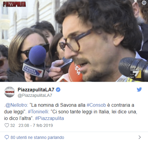 Incalzato dalla domanda “Lei lo sa che la nomina di Savona alla Consob è contraria a due leggi?” del giornalista di Piazza Pulita, Nello Trocchia, il ministro risponde in modo confuso: “Ci sono tante leggi in Italia, lei ne dice una io dico l’altra”.
