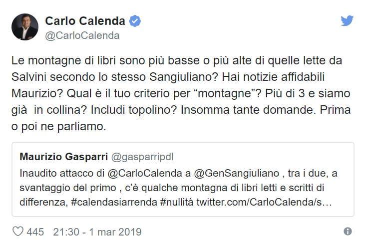 A far partire questa spirale era stato, il 2 marzo, l’esponente del Pd Carlo Calenda, che su Twitter aveva risposto a un attacco di Maurizio Gasparri. “Inedito attacco di Calenda al direttore del Tg2 Gennaro Sangiuliano – scriveva Gasparri – ma tra i due, a svantaggio del primo, c’è una montagna di libri letti e scritti di differenza”. La risposta di Calenda era stata al veleno: “Le montagne di libri sono più basse o più alte di quelle lette da Salvini secondo lo stesso Sangiuliano? Includi Topolino?”.