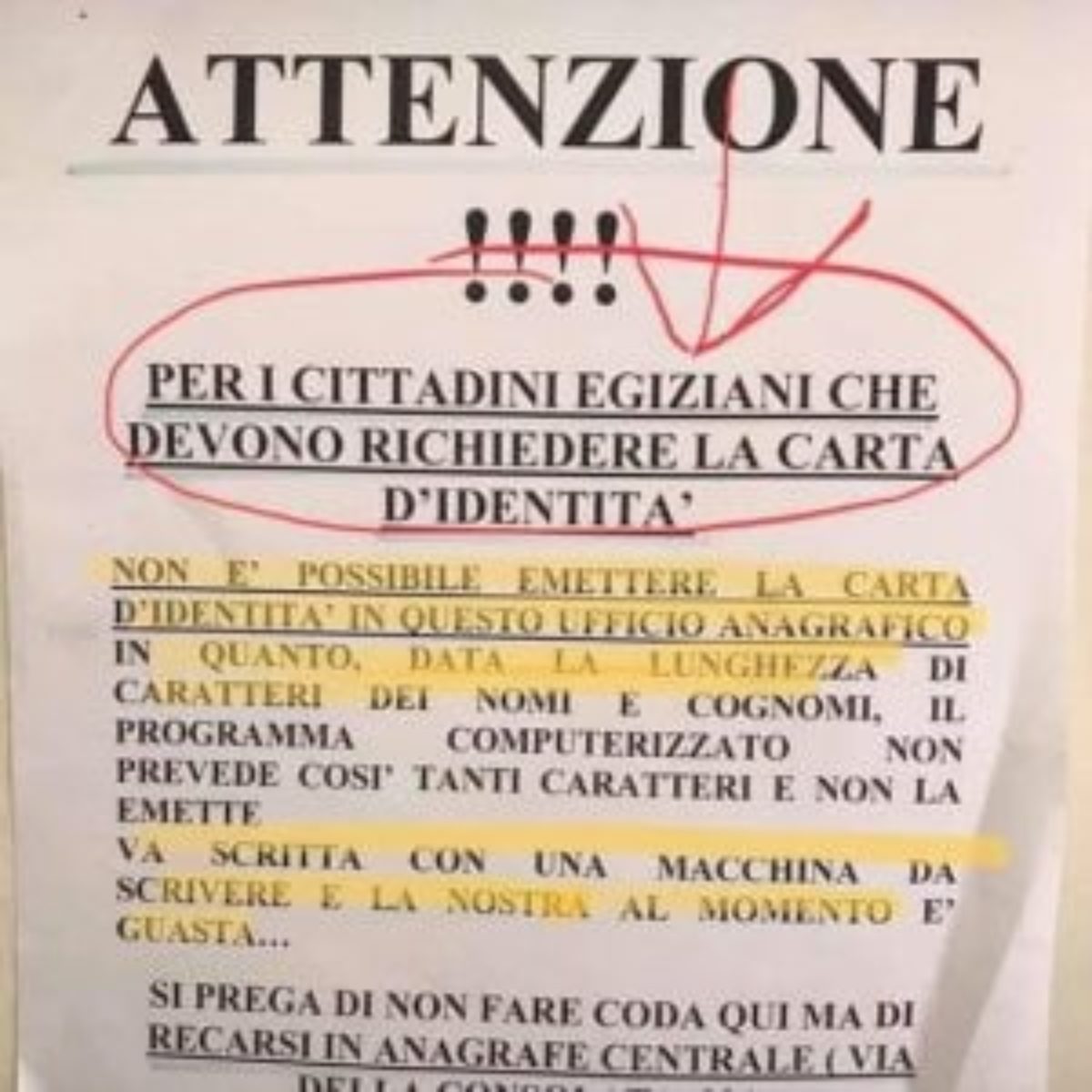 All’anagrafe di Torino non si rilasciano carte di identità a cittadini egiziani. Lo annuncia un cartello affisso nell’ufficio di via Leoncavallo, che spiega che i nomi sono troppo lunghi e strani.