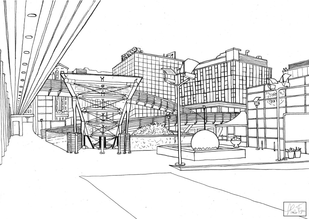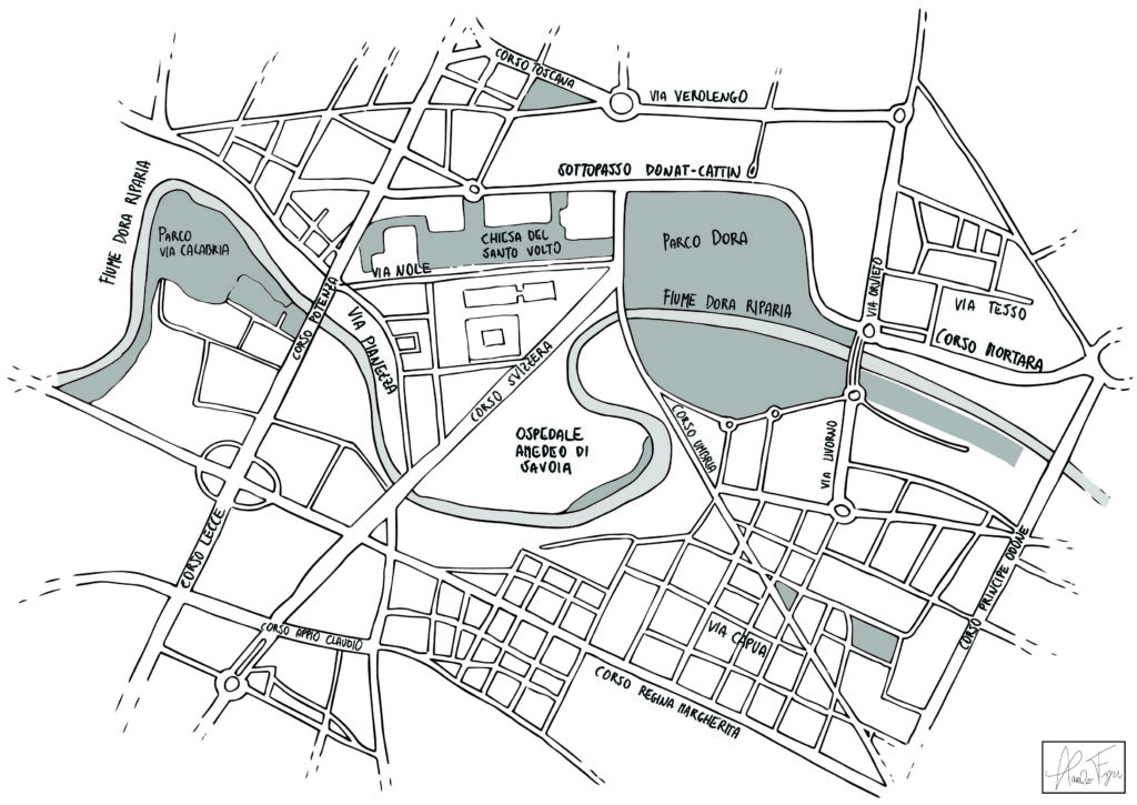 Muovendoci per questo spazio si incontrano un susseguirsi di strade a doppia percorrenza, rotonde in sequenza e torri di cemento di altezze scoordinate. Per chi non ha vissuto l’evoluzione del quartiere riuscirebbe difficile credere che fino a vent’anni fa la gran parte delle industrie di Torino fossero collocate lì.