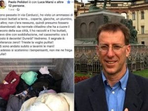 “Sono passato in via Carducci, ho visto un ammasso di stracci buttati a terra… coperte, giacche, un piumino e altro – aveva scritto Polidori in un post su Facebook, poi rimosso – Non c’era nessuno, quindi presumo fossero abbandonati. Da normale cittadino che ha a cuore il decoro della sua città, li ho raccolti e li ho buttati, devo dire con soddisfazione, nel cassonetto: ora il posto è decente. Durerà? Vedremo! Il segnale è: tolleranza zero! Trieste la voglio pulita!”.