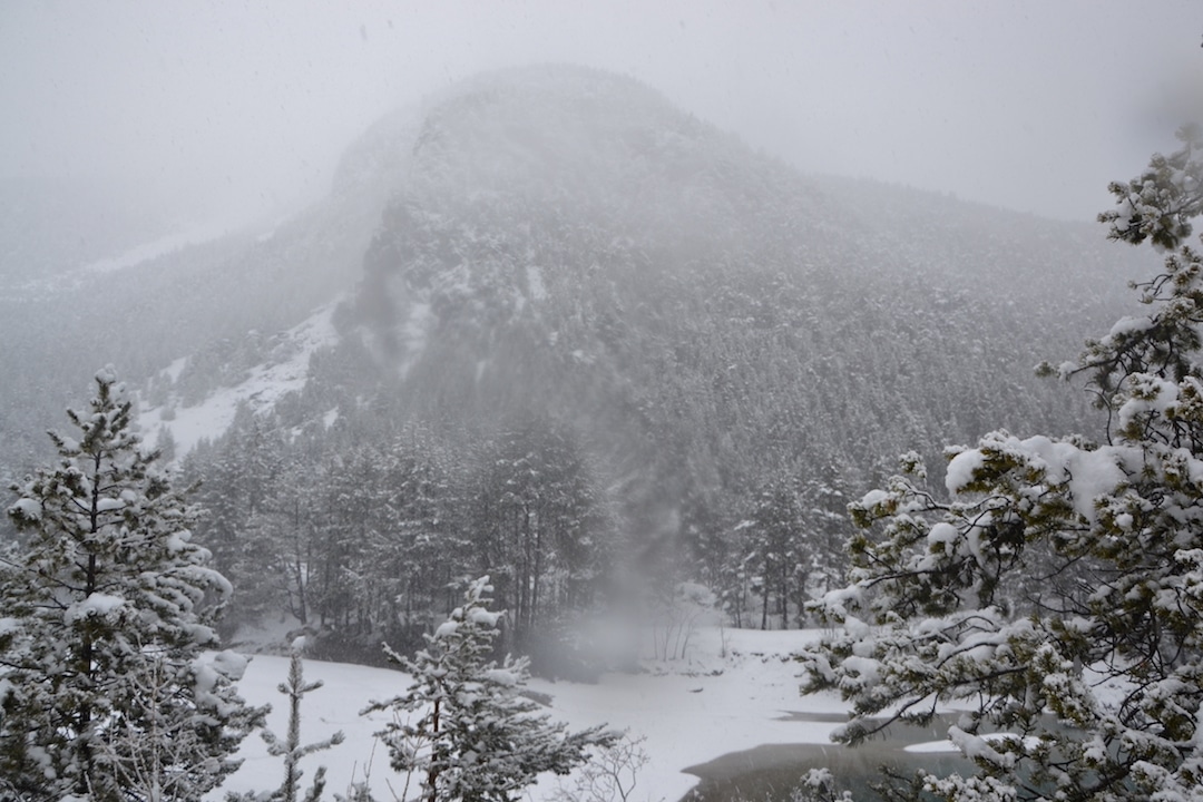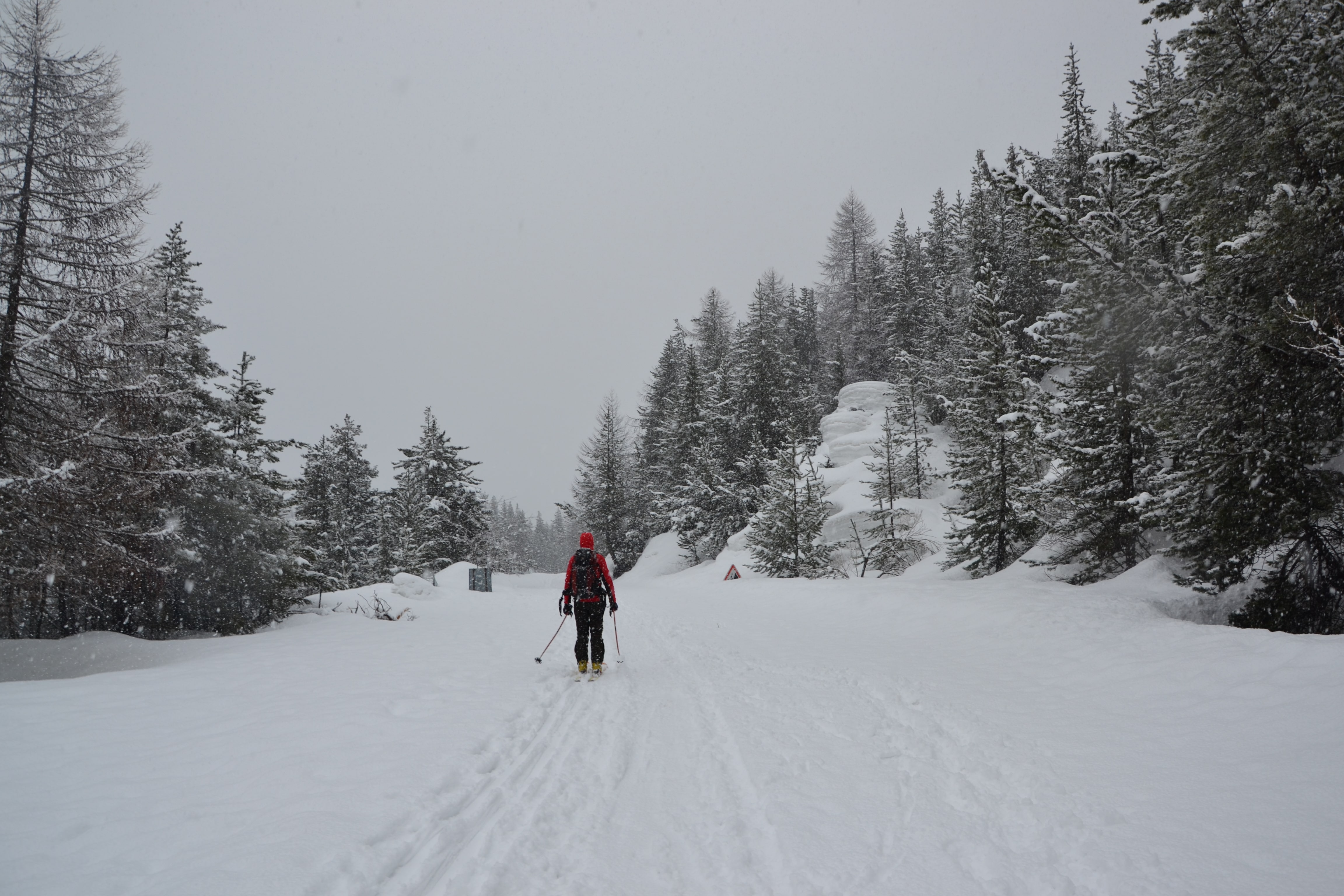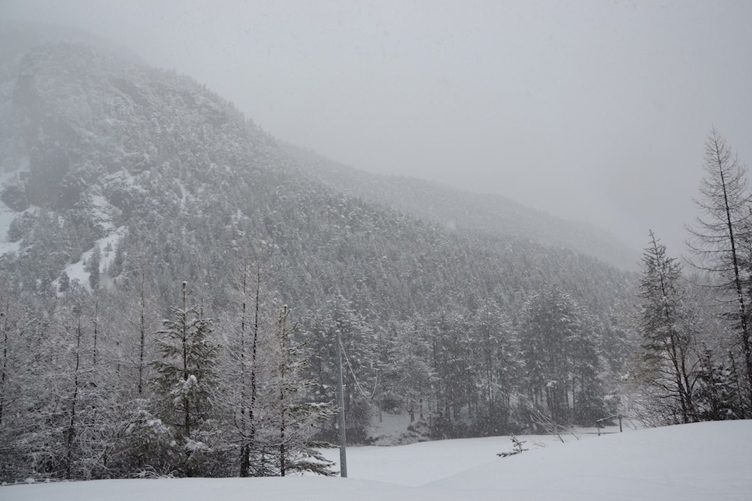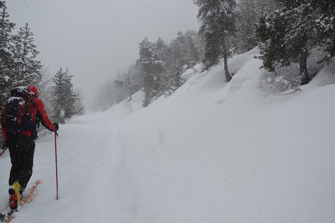Dopo i primi chilometri di strada asfaltata, si costeggiano le pista da sci e da lì si prosegue necessariamente a piedi, sul percorso battuto e fino al bivio che separa la strada turistica dal sentiero non battuto. Lì il tragitto si fa impervio, nelle giornate di pesante neve come questa restano poche tracce a condurre il percorso. Ma i migranti sanno quale strada seguire: seppur coperta di neve e appena percettibile all’occhio, resta un traccia, un segno centrale che altre persone prima di loro hanno tracciato. Lì la neve è compatta e non c’è il rischio di sprofondare. Ma basta un piede in fallo per restare sommersi dai centimetri di neve gelata.