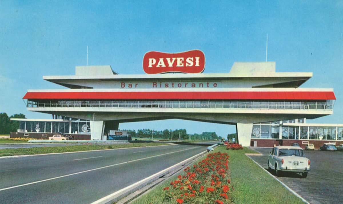 In un Paese che stava rimodellando una propria immagine dopo il fascismo, le autostrade e tutte le loro architetture erano, volutamente o meno, uno dei simboli della nuova Italia. E così le aree ristoro non erano semplici punti di sosta dove fare la spesa o il rifornimento, ma vere e proprie opere d’arte, che anche sotto l’aspetto visivo volevano rappresentare un Paese che guarda al futuro: dal primo autogrill a ponte d’Europa, quello di Fiorenzuola d’Arda, che avrebbe inaugurato una fortunata tradizione, al Villoresi di Lainate, opera di Angelo Bianchetti, finito non solo nei manuali d’architettura ma anche nelle guide turistiche.