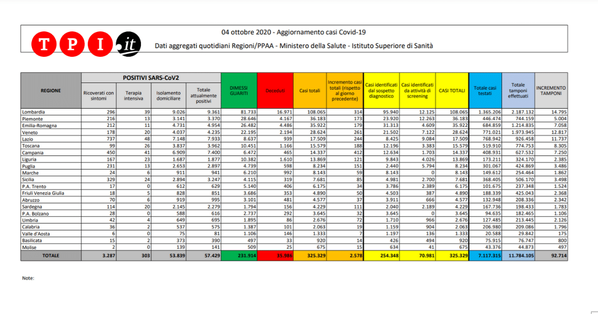 Una spiegazione potrebbe stare nel numero dei tamponi: negli ultimi due giorni infatti sono stati fatti più test che nei precedenti. Malgrado questo, i numeri non tornano: se infatti il 29 e 30 settembre la percentuale di tamponi positivi in rapporto alle persone testate era rispettivamente del 3,07 e del 2,97 per cento, negli ultimi due giorni si è saliti al 3,76 e al 3,48 per cento. Poi c’è la pista delle scuole, riaperte da tre settimane. Ma, nonostante 124 istituti siano stati chiusi per contagi e in oltre 900 si sia accertato almeno un caso, gli esperti del Cts continuano a parlare di “contagi intrafamigliari” e assicurano che “la colpa non è della scuola”.