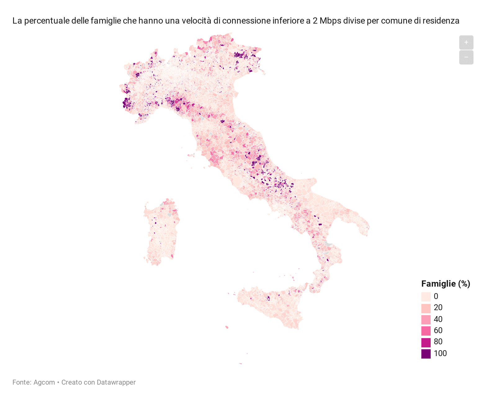 Non c’è da stupirsi, dato che soltanto il 9 per cento delle scuole primarie, l’11,2 per cento delle secondarie di primo grado e il 23 per cento delle scuole superiori ha la possibilità di usufruire di banda internet di qualità. Per quanto riguarda la fornitura di rete internet veloce nelle famiglie italiane, secondo i dati Istat 2018 una famiglia italiana su quattro non dispone nella propria abitazione dell’accesso alla banda larga, mentre solo in poco più del 30 per cento delle zone rurali italiane arriva una connessione a banda larga. E oltre alla frattura centro-periferia, esiste anche quella, ancora più marcata, dell’istruzione: sempre secondo l’Istat, solo il 16 per cento delle famiglie senza titolo di studio ha un accesso a banda larga fissa o mobile, contro il 95 per cento delle famiglie con laureati. Se si prendono i dati Agcom sulla copertura internet sul territorio nazionale, appare evidente come ancora in molti comuni la maggior parte delle famiglie non ha accesso a una rete sufficiente per garantire, ad esempio, di partecipare a una lezione in streaming, soprattutto nei territori montani delle catene appenninica e alpina.