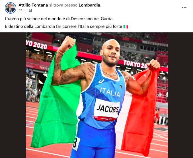 “L’uomo più veloce del mondo è di Desenzano del Garda. È destino della Lombardia far correre l’Italia sempre più forte”. Il presidente della Regione Lombardia Attilio Fontana scrive un post sul successo di Marcell Jacobs che ha vinto la finale dei 100 metri alle Olimpiadi di Tokyo 2020. Una soddisfazione immensa per il 26enne che ha sbriciolato un record incredibile. Una vittoria che indubbiamente ci rende tutti orgogliosi, in primis come italiani. Qualcuno però dovrebbe spiegare a Fontana, o al suo social media manager, che il paragone tra la regione Lombardia e il primato di Jacobs è un azzardo non da poco.