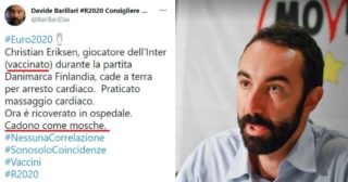No, Barillari che deve la sua patetica celebrità a un’imperterrita negazione della realtà soffiando su vomitevoli complotti immaginari, pensa subito a come può usare quel calciatore quasi morto per collezionare qualche like e per soffiare sugli sfinteri dei suoi seguaci e quindi come prima cosa pensa subito al vaccino, l’odiato vaccino che secondo lui una superiore entità mega segreta e potentissima avrebbe formulato per distruggere il mondo.