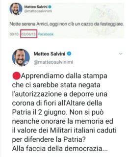 Rispetto al triplice richiamo alla Patria della manifestazione salviniana, l’implacabile memoria della Rete ha rispolverato uno dei numerosi tweet del leader leghista, che il 2 giugno del 2013 affermava che non ci fosse “un ca**o da festeggiare”. Poi, però, il tricolore è divenuto di gran moda anche tra chi in precedenza ne suggeriva usi originali.