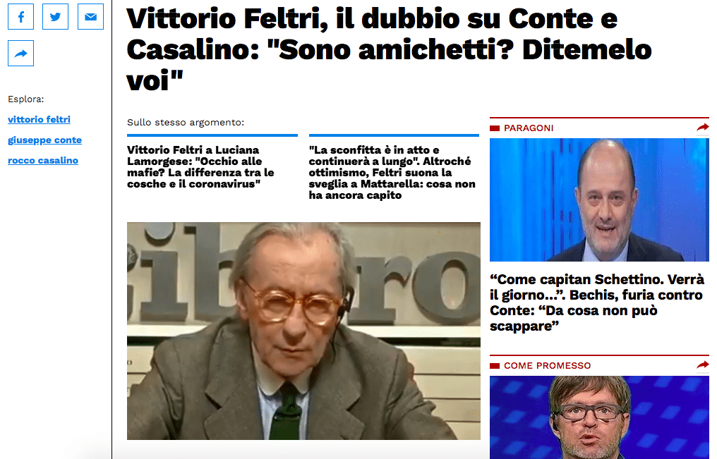 A essere un po’ meno “fatti suoi” è il modo con cui le sue stravaganze più o meno spontanee vengano utilizzate per costruire intorno al direttore di Libero tutto un indotto di share, di condivisioni social e di fotogrammi da vendere a un pubblico affamato di spazzatura. E se le puntuali cinque righe di citazione del suo giornale con titolo “acchiappa click” fanno ovviamente parte di una collaudata strategia commerciale di quart’ordine, sarebbe forse il momento che un certo mainstream la smettesse di sfruttare quelle che con ogni probabilità sono le debolezze di un uomo per far soldi. Ogni riferimento agli autori di certi talk show non è puramente casuale.