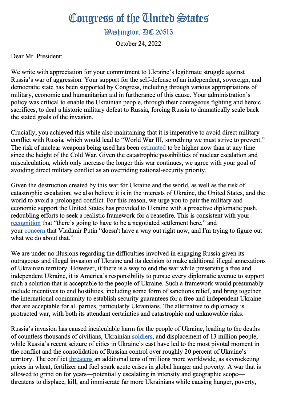 Questa settimana almeno trenta deputati democratici hanno scritto una lettera a Joe Biden chiedendogli di attivare ogni canale possibile per instaurare un dialogo diplomatico con Putin e arrivare a un cessate il fuoco in Ucraina.