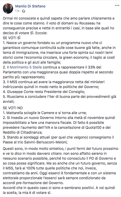 Il Movimento Cinque Stelle forse teme di essere sconfessato dalla sua base. È forse per questo che nelle ultime ore c’è la corsa al post da parte di molti esponenti grillini per spronare i loro elettori a votare Sì all’accordo con il Pd per un governo Conte bis. Il voto sulla piattaforma Rousseau sarà aperto domani dalle 9 alle 18.