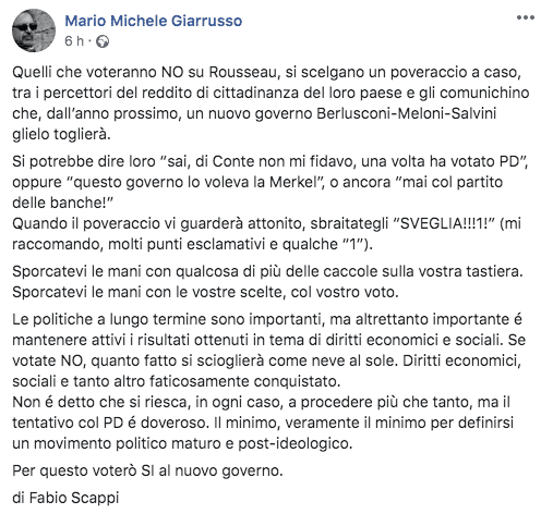 Interviene nel dibattito anche Mario Giarrusso, portavoce M5s al Senato, che fa leva sul reddito di cittadinanza, per spingere gli elettori a votare Sì. “Il tentativo col Pd è doveroso”, dice Giarrusso, sottolineando come sia l’unico modo per mantenere i risultati ottenuti dal Movimento negli ultimi mesi. Qui il suo post: