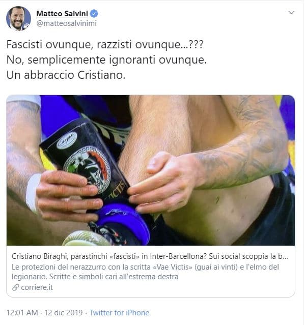 Sono stati due giorni difficili per Cristiano Biraghi, il calciatore dell’Inter e della Nazionale italiana finito nella bufera sui social a causa dei parastinchi indossati durante la partita di Champions League contro il Barcellona: sul caso è intervenuto anche Matteo Salvini. Che su Twitter ha preso le difese del giocatore.