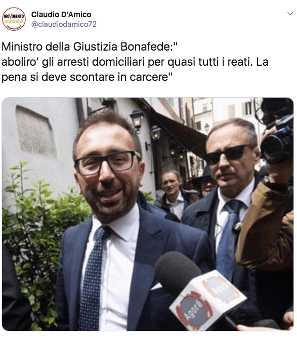 “Ministro della Giustizia Bonafede: ‘Abolirò gli arresti domiciliari per quasi tutti i reati. La pena si deve scontare in carcere”, si legge nel tweet postato dall’utente @claudiodamico72, che al momento risulta aver ragranellato 333 retweet e oltre 700 like.
