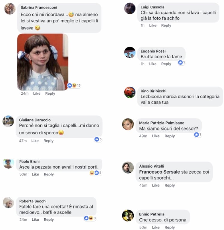“Ascella pezzata non avrai i nostri porti”. “Fatele fare una ceretta, è rimasta al Medioevo: baffi e ascelle”. “Sembra la figlia di Fantozzi. Ma lei vestiva meglio e i capelli almeno li lavava”. “Sparati, vacca”. “Lesbicona marcia”. “Brutta come il cancello del cimitero”. “Ma siamo sicuri del sesso?”. “Fai un favore al Pianeta: muori”.