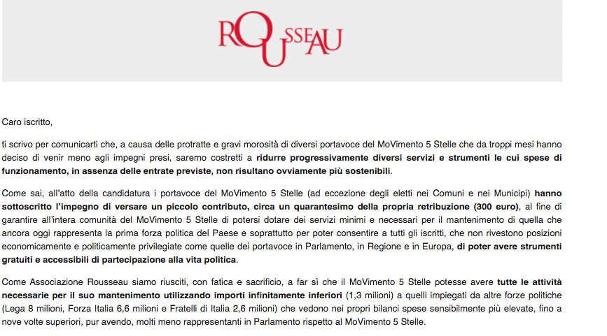 “Caro iscritto, ti scrivo per comunicarti che, a causa delle protratte e gravi morosità di diversi portavoce del MoVimento 5 Stelle che da troppi mesi hanno deciso di venir meno agli impegni presi, saremo costretti a ridurre progressivamente diversi servizi e strumenti le cui spese di funzionamento, in assenza delle entrate previste, non risultano ovviamente più sostenibili”. È quanto si legge nel testo di una lettera inviata dal presidente di Rousseau, Davide Casaleggio, agli iscritti dell’Associazione, annunciando una graduale riduzione dei servizi della piattaforma, a causa delle morosità degli eletti M5S nel versamento del contributo mensile di 300 euro.